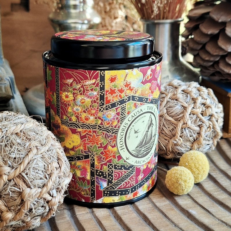 Boîte métal laquée noir, recouverte de papier washi. Diamètre 8 cm, Hauteur 10 cm.