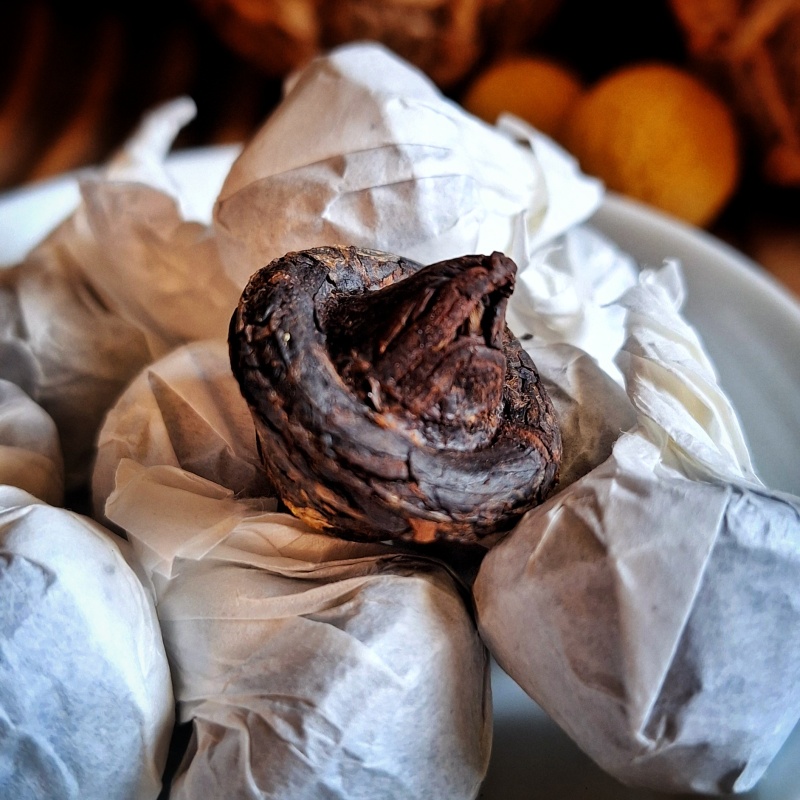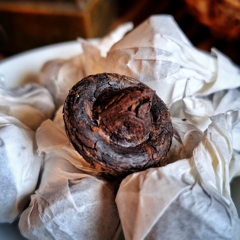 Issu de vieux théiers, parfois centenaires, il est récolté à la main lorsque les feuilles sont gorgées de sève et de brume. Après le flétrissage et l’oxydation propre aux thés hong, la matière vivante est patiemment pressée, puis laissée à mûrir lentement, comme on confie un secret au temps.