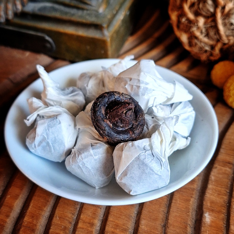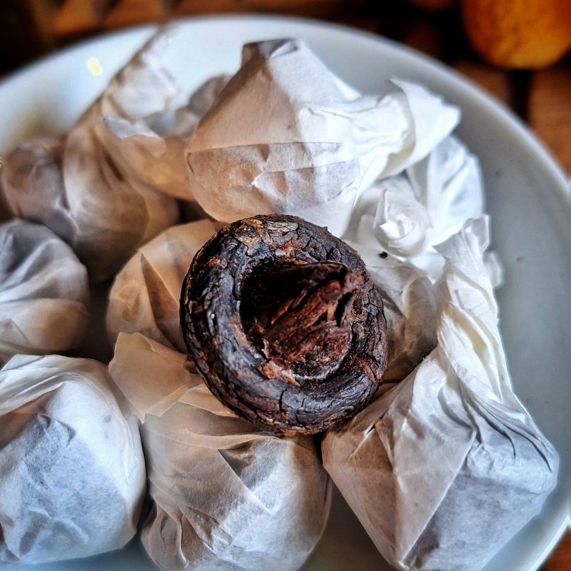 Né des montagnes embrumées du Yunnan,"Récolte d'ambre de Simao"  (Xiao Mo Gu shu) évoque d’emblée une curiosité ancienne : un thé compressé en forme de champignon, humble et sacré à la fois.